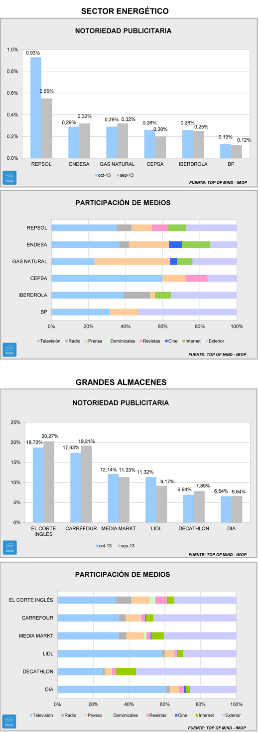 En el último puesto reaparece Dia en detrimento de Ikea, que sale del grupo. Por procedencia de notoriedad, Carrefour ha visto incrementarse la participación de la televisión. El Corte Inglés, Carrefour y Media Markt presentan una distribución por medios similar, al igual que los dos discount, Lidl y Dia. Decathlon por el contrario, va por libre.