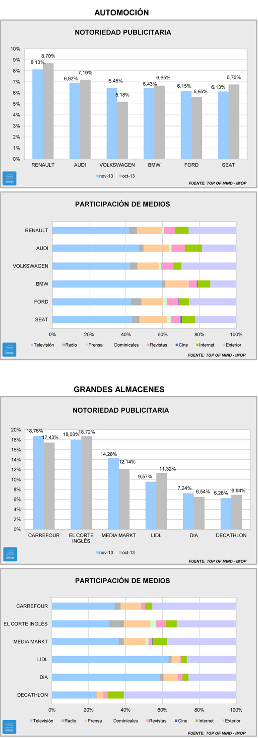 En Grances Almacenes, Carrefour supera a El Corte Inglés por 0,73 puntos. En 2012 la situación era la contraria con una diferencia de más de un punto de la enseña española. La subida porcentualmente más importante es la de Dia, que supera a Decathlon.