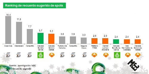 Los tres spots más recordados (recuerdo sugerido) fueron emitidos en Telecinco y, se indica en este informe, corresponden con las marcas más recordadas en 2012: Coca-Cola, que alcanzó un grado de recuerdo del 14,4% y Campofrío y Mastercards, cada uno con un 11,5%. Estrella de Galicia fue el spot más recordado en La Sexta, con un índice del 9,1% y también en Antena 3, con un 7,7%.