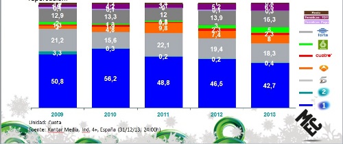 Como es habitual, la mayor audiencia se concentró en La 1, que obtuvo una cuota de pantalla de 42,7%, aunque perdió 601.000 espectadores, anotando su mínimo histórico con 6.095.000 individuos. Le siguió Telecinco, que disminuyó su audiencia respecto al año anterior en 180.000 espectadores, con lo que obtuvo una audiencia de 2.611.000 espectadores y un 18,3% de cuota de pantalla. Por su parte, Antena 3 ganó 78.000 espectadores respecto a las campanadas de 2012 y congregó a 1.145.000 inidividuos. Detras, La Sexta obtuvo una audiencia de 713.000 espectadores, 274.000 individuos más que el año anterior y que supone un incremento del 62%. Cuatro, cadena que emitió las campanadas en señal conjunta con Telecinco, obtuvo una audiencia similar a la obtenida el año anterior 335.000 espectadores.
