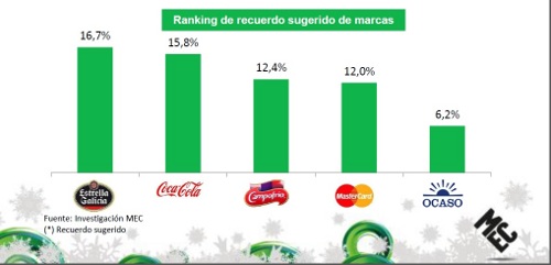 De este modo, Estrella de Galicia se ha convertido en la marca que ha obtenido un mayor índice de recuerdo sugerido, desbancando de esta posición a Coca-Cola, que fue líder el año anterior. y que en esta ocasión, con el primer spot del año en Telecinco y Cuatro, consiguió un recuerdo del 15,8%.