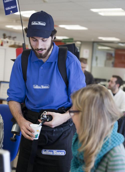 Gallina Blanca repartió más de 500 litros de sopa en las redacciones de los principales medios de comunicación españoles. A lo largo del día, repartidores ataviados con mochilas, han recorrido más de una veintena de redacciones de Barcelona y Madrid, ofreciendo a unos 2.000 periodistas caldo caliente para afrontar la jornada laboral.
