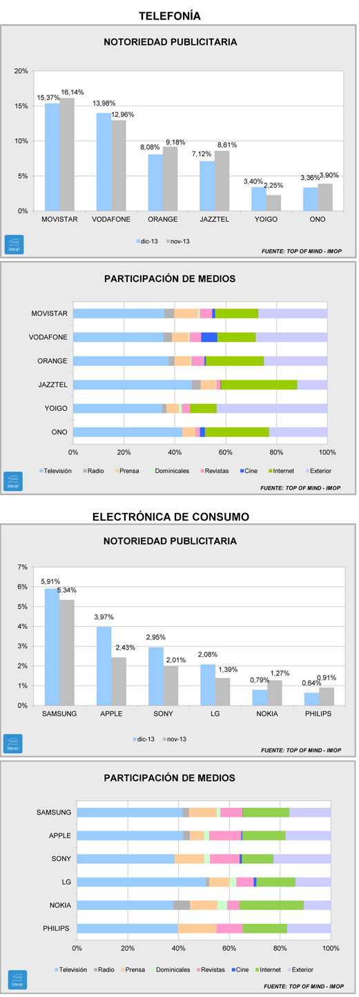 En el último diciembre, las tres primeras operadoras tuvieron entre dos y tres puntos menos de notoriedad que el mismo mes del año anterior. Sin embargo, en las tres siguientes, el resultado fue el opuesto: todas subieron. Jazztel remató su gran ejercicio acercándose a menos de un punto de Orange. Yoigo, consiguió entrar en el grupo en el mismo puesto que antes tenía Telefónica y Ono ganó 1,2 puntos de notoriedad, lo que en su caso supone porcentualmente un importante crecimiento.