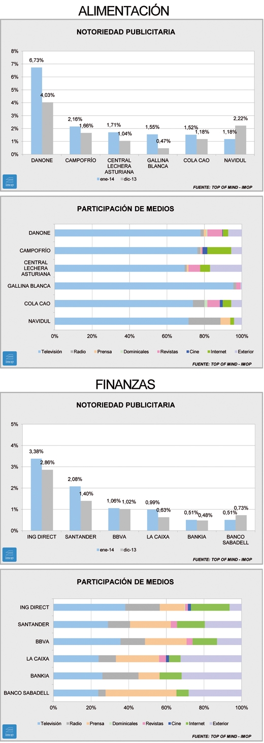 En general, todo el sector refleja una menor notoriedad, aunque hay marcas que entran y salen, pero en casi todos los puestos, sin tener en cuenta la marca, se observa menos notoriedad que hace un año, comenzando por la líder, Danone, que cae más de un punto. Sobre enero de 2013 entran Central Lechera Asturiana, Gallina Blanca y Navidul. Y salen Pascual, Bimbo y Nestlé.