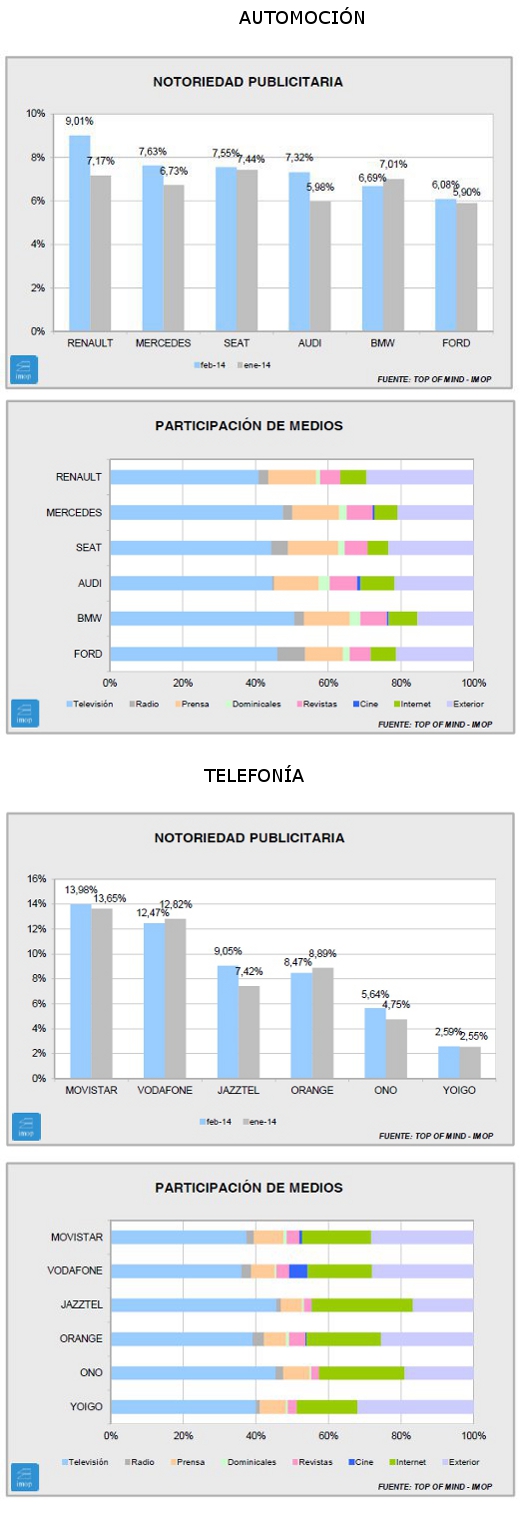 En Telefonía, los resultados positivos dominan. Lo más interesante es que Jazztel sigue su tendencia ascendente y supera ya a Orange gracias a una subida que le pone por encima del 9% por primera vez. Porcentualmente aún es mayor la subida de Ono, superior al 100%. En ambos casos, coincide con un notable incremento porcentual de la notoriedad que les aporta a ambas marcas el medio televisión.