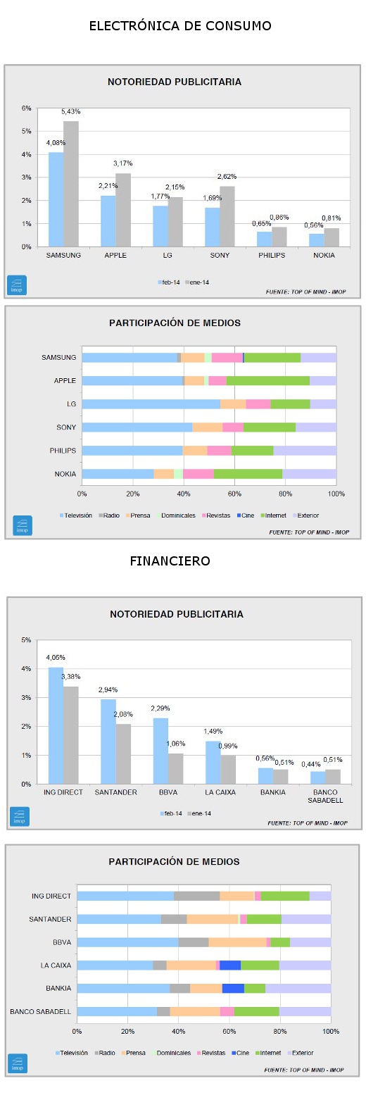 En cuanto a Financiero, si bien el líder, ING Direct, ve descender su notoriedad (en este caso comparamos con el mismo mes del año anterior) en 0,75 puntos, Santander y BBVA han tenido un súbito despertar. El primero, superando a su competidor que hace un año era segundo. La subida de nuestros dos bancos más internacionales ha sido de más de un punto en el caso de Santander y de cerca de o,3 en el BBVA, ambos con un buen impulso desde el mes de enero. La bajada destacada corresponde a Sabadell, que pierde más de 0,8 puntos, porcentualmente casi dos tercios sobre el año pasado.