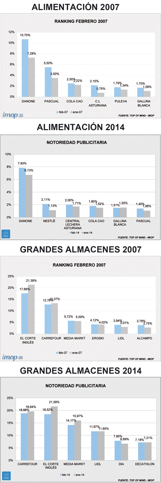 Así, en el caso de Alimentación vemos que las dos marcas líderes destacadas de hace siete años han tenido la mayor caída, especialmente la segunda. Danone cae casi 3 puntos y Pascual más de 3,5. A partir de ahí, las marcas con menos notoriedad parecen haber aguantado mejor, aunque porcentualmente hay una fuerte caída de Cola Cao. En procedencia de notoriedad la televisión ha pasado de ser casi medio único a aportar entre el 60% y el 80%.