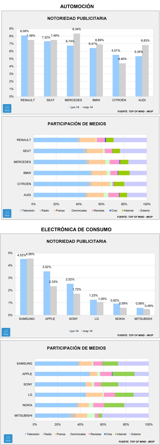 En Electrónica de Consumo, encabezada por Samsung, lo más notable es el fuerte tirón de notoriedad de Apple, aunque Sony no se queda muy atrás porcentualmente. En general, todas suben. En el caso de la marca de la manzana, su crecimiento viene acompañado de una importante aportación de la televisión. Hay que recordar también la inauguración de la tienda bandera de la marca en la madrileña Puerta del Sol.