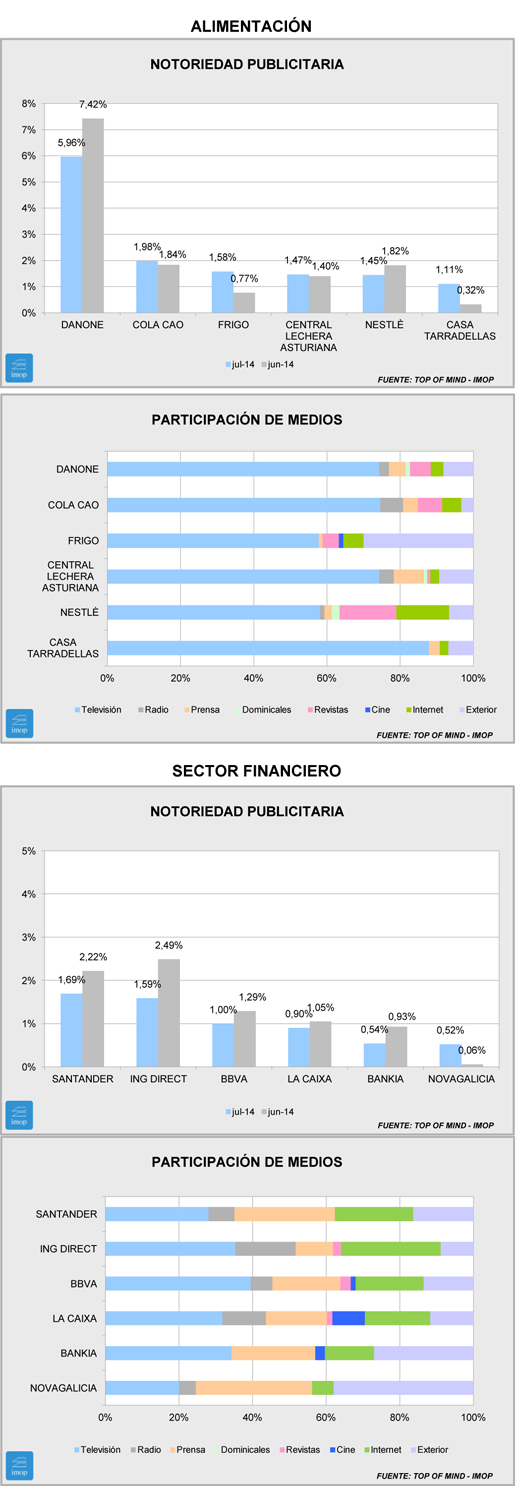 Es el caso por ejemplo de ING Direct en Financiero. Es la primera vez desde que hacemos estos comentarios que el banco directo no está en el primer puesto. Respecto del mismo mes del año anterior pierde 2,9 puntos y se queda con menos de un 40% de notoriedad que entonces. Eso le permite a Santander colocarse en cabeza aun perdiendo un tercio de punto. Sin embargo, el resto de enseñas bancarias sube ligeramente.