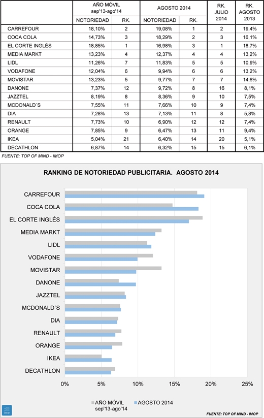 Si nos fijamos en las dos únicas marcas de productos envasados que quedan en el ranking de las quince primeras, Danone y Coca-Cola, vemos que curiosamente ambas consiguen máximos del año. La marca de bebidas, muy asociada al Mundial, logró en agosto de este año 2,2 puntos más que el año anterior. Danone también consiguió más notoriedad que el año pasado (1,6 puntos) pero, sobre todo, recuperó nada menos que 3,8 puntos sobre el mes de julio, en el que llegó a salir del ranking.