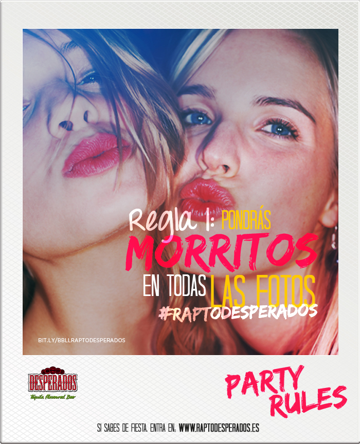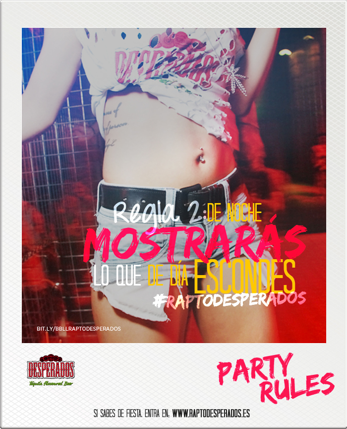 Quienes quieran optar a una entrada triple en Twitter deberán mantenerse atentos al hashtag #PartyRules durante las próximas semanas, y tuitear la regla publicada por @Desperados_es (ej. “De noche mostrarás lo que de día escondes”), mencionando a dos amigos que la cumplan siempre. Si los amigos hacen retuit de dicha mención podrán ganar tres entradas para acudir a la fiesta. Desperados también repartirá invitaciones a través de Facebook, donde los fans tendrán que mencionar en la regla posteada por la marca a los dos amigos que no se la saltan.