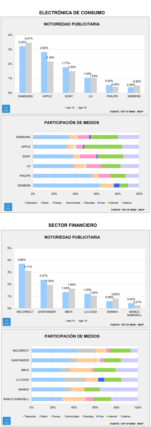 En el primero, es ING Direct el que cae sobre el mismo mes del año pasado. Un mes que estaba aún en puertas de su gran lanzamiento de este otoño, sus productos para empresas. Por detrás, Santander, BBVA y La Caixa mostraron estabilidad, aunque de distinto signo. Banco Sabadell cierra el grupo, y en el puesto anterior entra Bankia, en lugar de Evo Bank. Por medios, destaca que Santander gana notoriedad desde la televisión y BBVA la pierde, igual que Sabadell, que sigue variando enormemente su patrón de un año a otro.