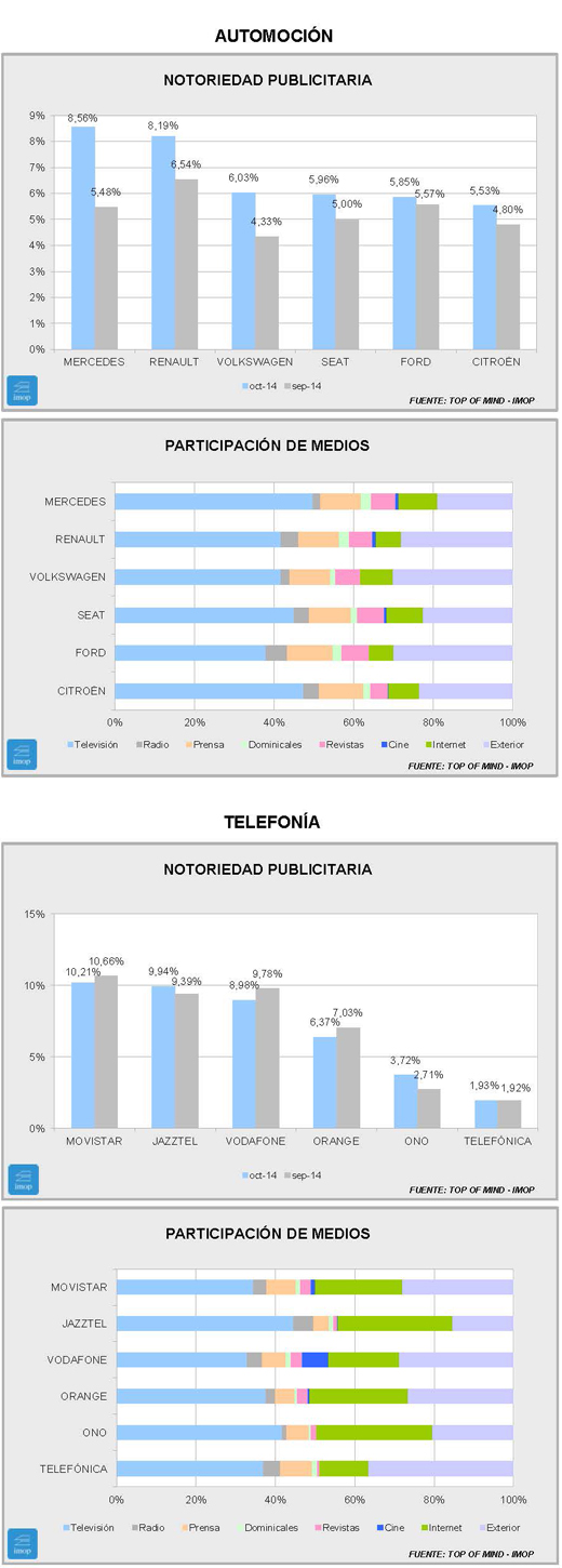 En Telefonía el panorama mantiene la extraña situación del mes anterior, en el que las dos más grandes y normalmente muy destacadas, Movistar y Vodafone, siguen con recortes muy fuertes sobre su notoriedad del mismo mes del año anterior: 5,3 puntos la primera y 3,2 la segunda. Orange parece también contagiada de esta tendencia. La excepción es Jazztel que con 0,8 puntos más se sitúa por primera vez entre las dos grandes. En el caso de estas y viendo la procedencia de su notoriedad por medios, lo único que puede reseñarse es una ligera pérdida desde el medio TV.