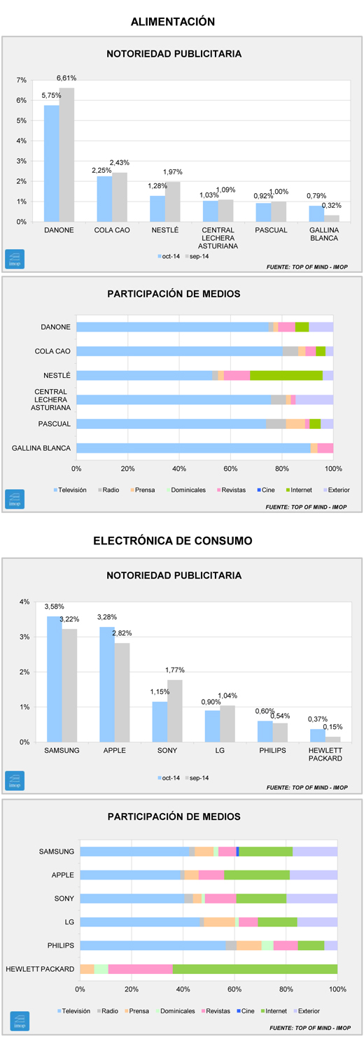 En cuanto a Electrónica, que podemos comprar solo con el mes anterior, empieza a prepararse para la temporada alta. Samsung en la cabeza, mantiene una ligera ventaja sobre Apple. Ambas suben sobre septiembre. Sony, sin embargo, es la nota negativa. LG cae mucho menos y en el último puesto entra Hewlett Packard, que presenta una procedencia de la inversión muy volcada en internet.