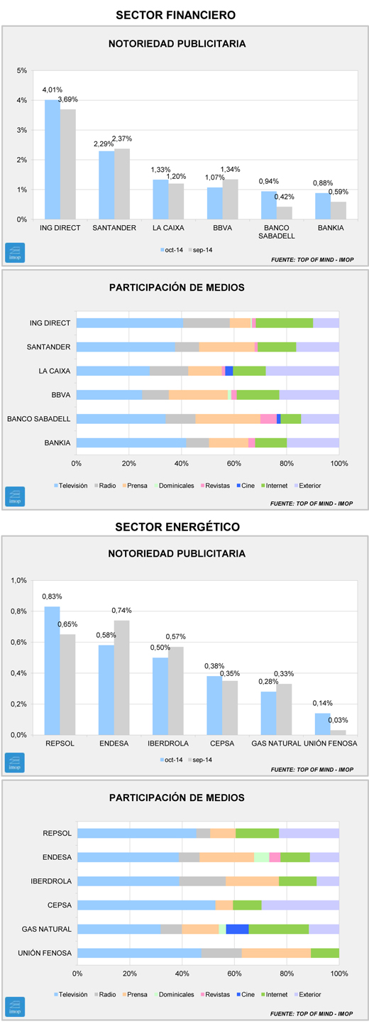 En el primer caso, ING sigue en cabeza con una mínima pérdida respecto octubre del año pasado. Santander, segunda, es el caso contrario. Detrás hay algo más movimiento. La Caixa marca un incremento de 0,5 puntos en términos absolutos que en términos relativos es de un 40% y eso le permite pasar a BBVA que tiene el comportamiento contrario con una pérdida también de medio punto. En cuanto a la procedencia de notoriedad por medios, si bien con estos niveles de notoriedad la fiabilidad es baja, parece que hay unas cuantas marcas que han bajado en prensa. Están las mismas marcas que en 2013.