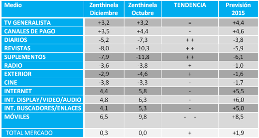 De cara a 2015, los panelistas esperan que la inversión total en medios crezca algo más del 1%. El mayor crecimiento corresponderá ya a los medios convencionales, "lo que es habitual en momentos de crecimiento de la economía", señalan los responsables del estudio, mientras que los no convencionales "tienen una característica defensiva, de medio refugio". El crecimiento que se espera para los medios convencionales se sitúa en el 1,9%, mientras que para los no convencionales es del 1,4%.