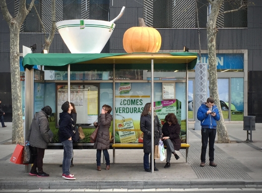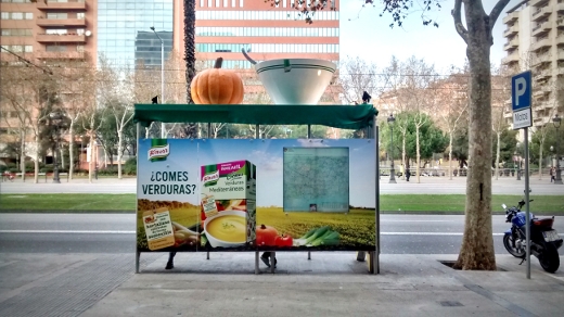 Con la colaboración de Havas SE, JCDecaux y Mindshare, la parada de autobús de esta concurrida zona de la Ciudad Condal se ha vinilado con los colores corporativos y productos de cremas de verduras Knorr. Asimismo, el techo de la misma figura ser una mesa cubierta con un mantel verde en la que reposa un tazón gigante de crema de verdura lista para consumir, junto con una cuchara y una calabaza de gran tamaño.
