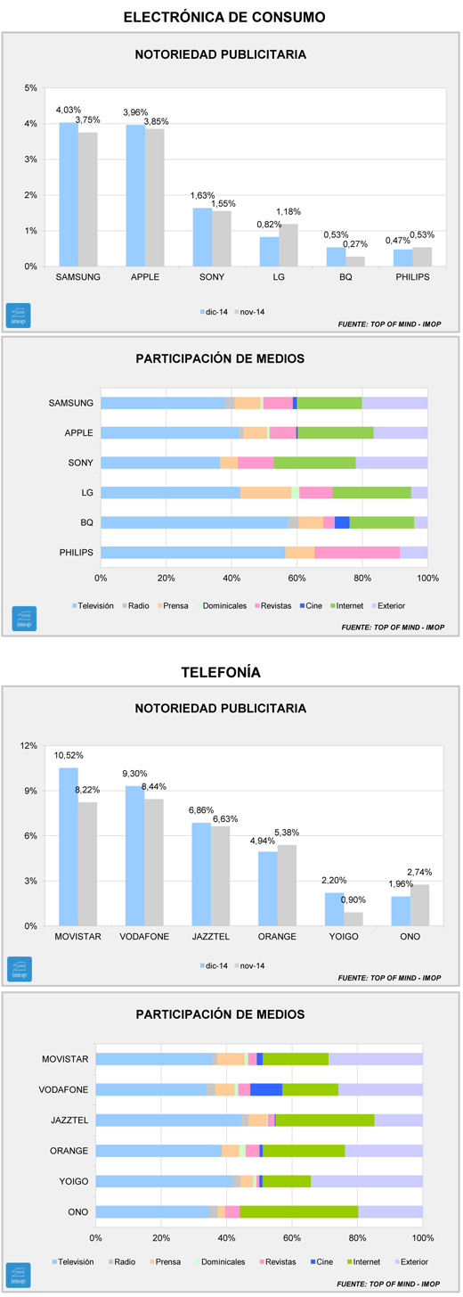 Destaca sobre todo la subida de Movistar, líder del sector, que compaginó el mes de diciembre las campañas de Movistar Series y la de Fusión TV. Le sigue Vodafone, que estrenó sendas creatividades navideñas dentro de su estrategia ‘Power to you’. Orange y Ono sufrieron caídas en su notoriedad.