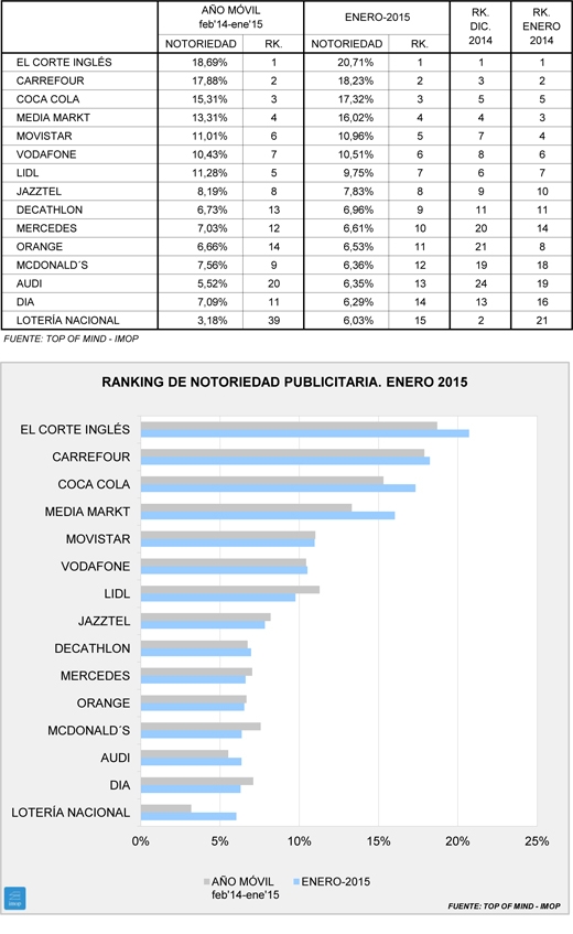 Le siguen Carrefour, Coca-Cola y Media Markt. Destaca el incremento de casi tres puntos respecto al año móvil (febrero 14-enero 15) de este último anunciante, que desde que cuenta con Arturo Valls como prescriptor (noviembre de 2014) ha notado un repunte en su notoriedad todos los meses.