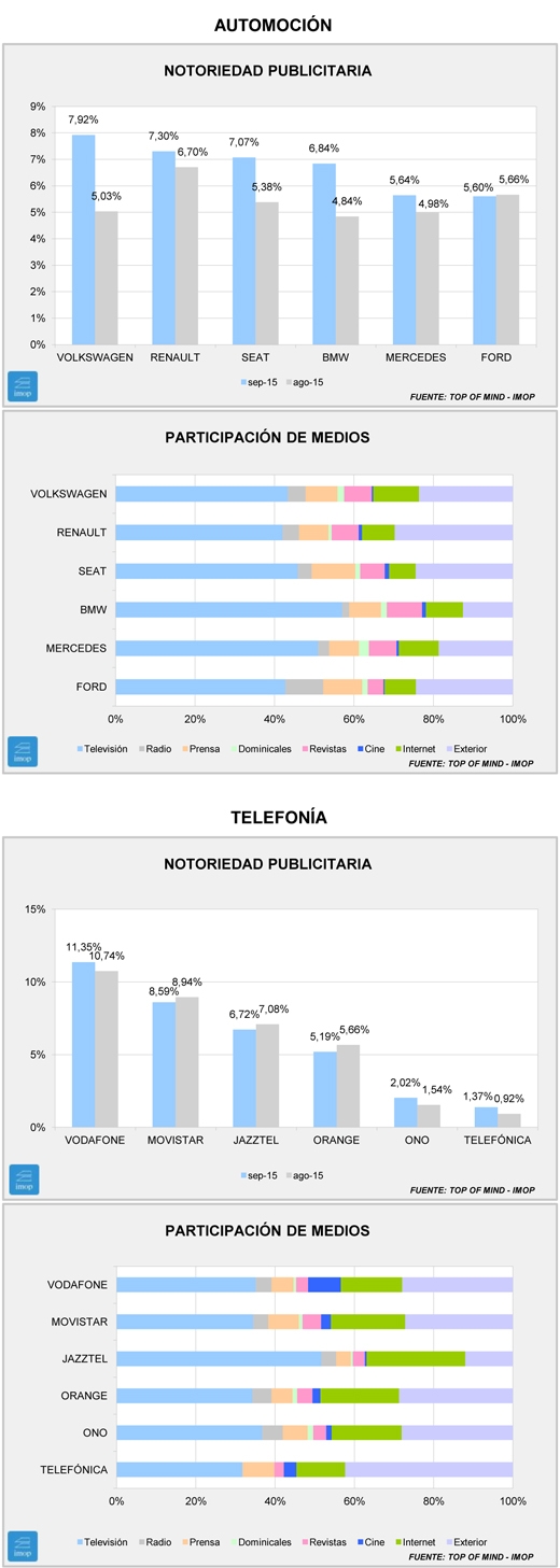 Por otra parte, en el sector de la Telefonía la batalla se está librando en el negocio de la televisión, con campañas en activo de los dos líderes, que siguen en las mismas posiciones que en el mes de agosto, con Vodafone a la cabeza, con un crecimiento que le hace superar el 11%. Mientras, Movistar, cae unas décimas.