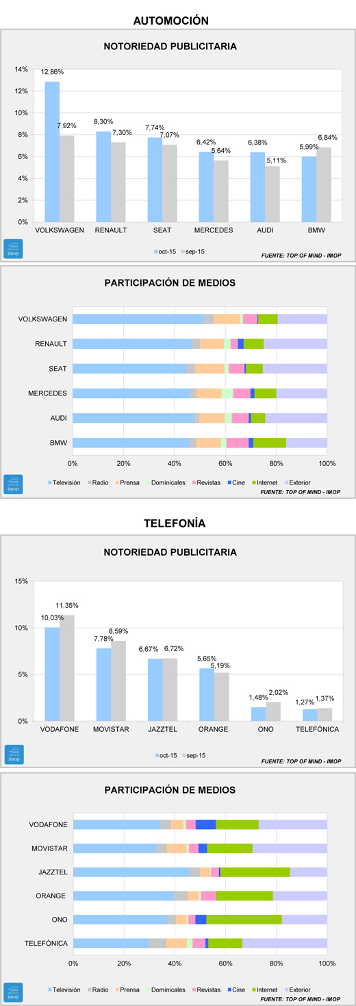 Como ya habíamos mencionado hace un par de semanas, el escándalo de Volkswagen lleva a la marca a situarse en el sexto lugar del ranking general y a superar un porcentaje de notoriedad inusual para su sector, rozando el 13%. Por supuesto, lidera el sector Automoción por segundo mes consecutivo. Renault, Seat, Mercedes y Audi también superan sus datos del mes anterior.