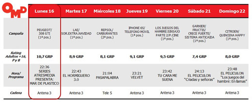 La época dorada que vive “El Hormiguero 3.0” impulsa a la ficción nacional de la cadena de Atresmedia, logrando el lunes en el bloque de entrada de “Mar de plástico” el spot de oro semanal para la campaña del Peugeot 308 GTI, con 10,7 Grp’s.