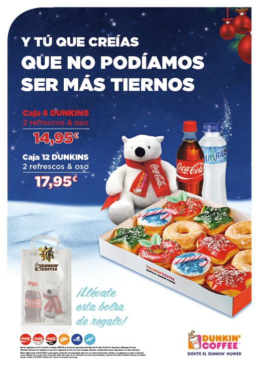 Asimismo, la compañía ha lanzado una promoción especial de Navidad, que incluye una caja de 6 ‘dunkins especiales’ y dos refrescos por 14,95 euros, con regalo del tradicional oso de Coca Cola. En el caso de la caja de 12 ‘dunkins’, el precio total de la promoción, con refrescos y el oso de regalo sería de 17,95 euros.