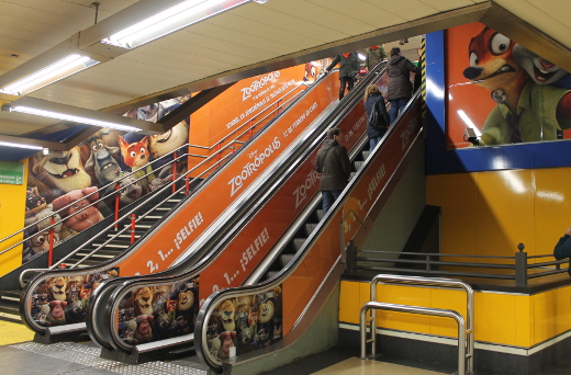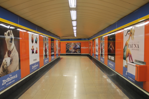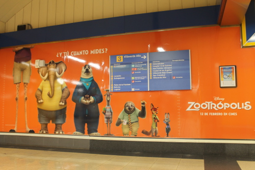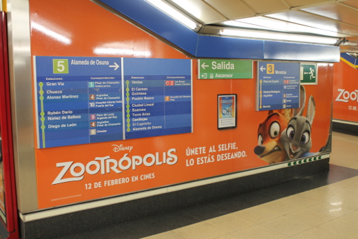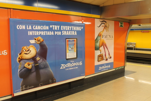 Con esta campaña Disney ha convertido la estación de Callao del Metro de Madrid en “Zootrópolis”, adueñándose de diferentes soportes para que las personas convivan con los personajes de la película. Los casi 2 millones de viajeros que pasan por esta céntrica estación compartirán su espera en el metro con los personajes de la película y viajarán con ellos en vagones customizados.