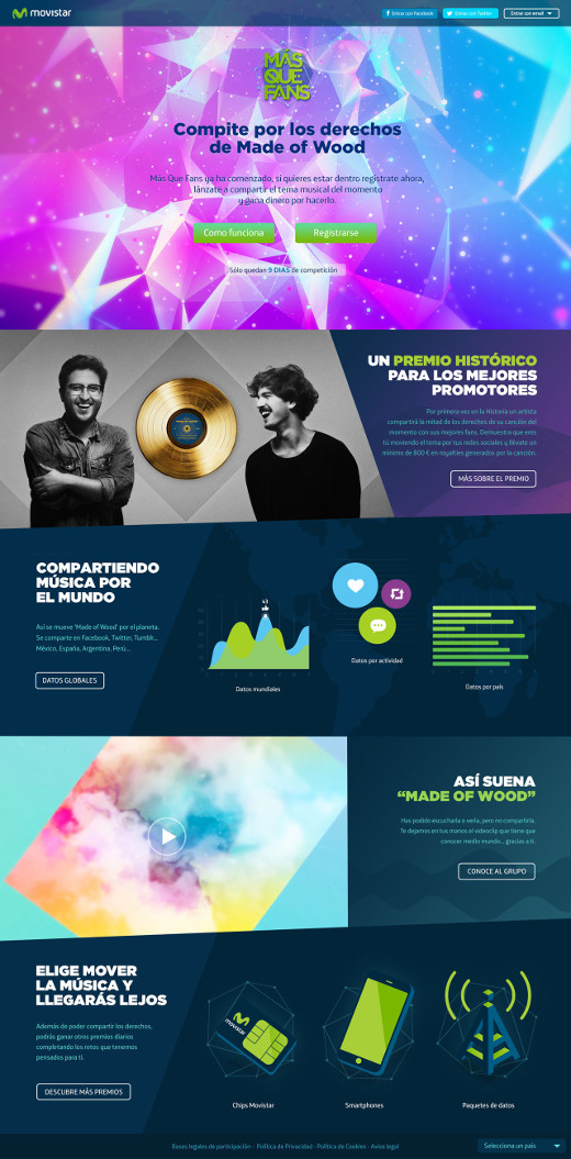 Los dos ‘fans’ que mayor puntuación alcancen al terminar la campaña en cada país. O dicho de otro modo: los que más lejos lleven el tema ‘Made of Wood’. Además, a través de la propia plataforma, los seguidores no sólo podrán visualizar de una manera interesante su actividad en la red sino que también podrán participar en una serie de minijuegos relacionados con la canción y el grupo, para ir escalando posiciones y optar también a una serie de premios sorpresa diarios facilitados por los ‘partners’ de Movistar.