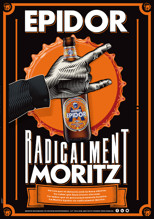 Realizada con la colaboración del conocido ilustrador barcelonés Francesc Punsola, el trabajo parte de una potente imagen gráfica que utiliza el símbolo de una mano haciendo los cuernos como elemento principal para comunicar su mensaje “Radicalmente Moritz”.