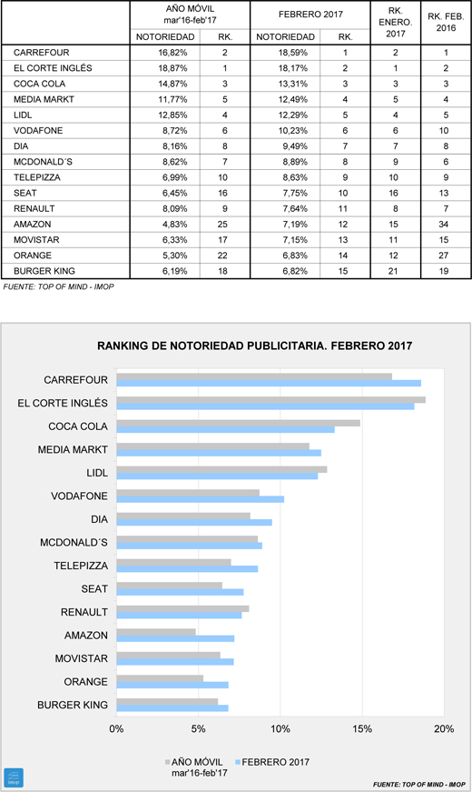 Otra marca que progresa es Amazon, que escala hasta la decimosegunda posición. Además es la única cuya notoriedad procede mayoritariamente del medio internet.