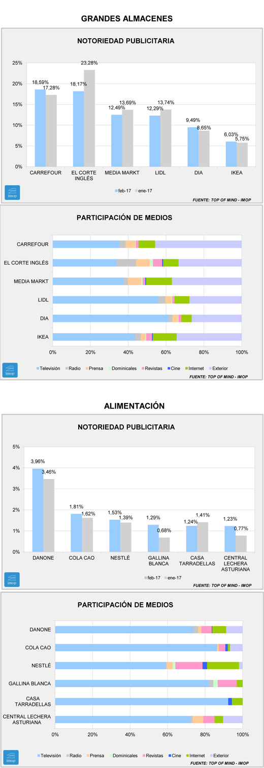 Por su parte, en el sector de los Grandes Almacenes sí ha habido cambios en el liderazgo, puesto que Carrefour ha adelantado a El Corte Inglés. Media Markt y Lidl ven caer su porcentaje de notoriedad, mientras que Dia e Ikea la ven aumentar.