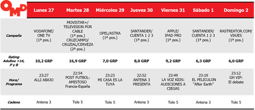 Sobrepasando los 10 Grp’s desde que aterrizó en la parrilla, la serie de Antena 3 “Allí abajo” garantizó el spot de oro del lunes para Vodafone. Igualmente ocurrió el viernes con “La Voz Kids”, de Telecinco, que cada semana está logrando el mayor ‘rating’ del día frente a “Tu cara no me suena”. Ese día los Grp’s fueron para la campaña del iPad Pro de Apple.