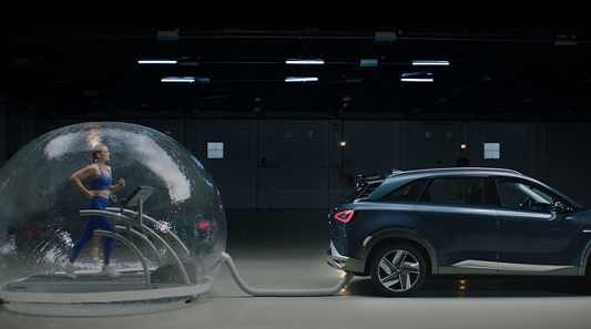 En el spot, la campeona olímpica se enfrenta al desafío de entrenar dentro de una burbuja conectada al tubo de escape de un Hyundai NEXO, respirando directamente las emisiones del vehículo.