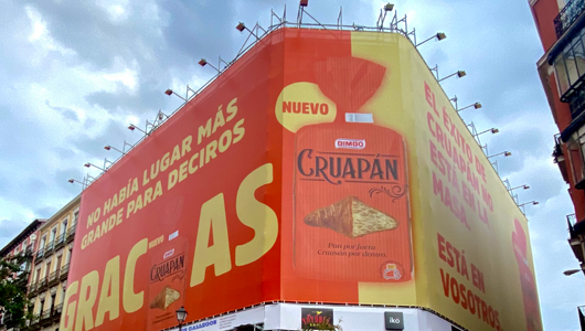 Y es que a los pocos días de salir al mercado y estar en los lineales de los principales supermercados, Cruapán se convirtió en todo un fenómeno en TikTok y en Instagram. El 'Pan por fuera y cruasán por dentro' se hizo viral rápidamente. Grupo Bimbo ha querido agradecer a los usuarios su 'cariño' hacia este nuevo producto mandándoles un mensaje a través de una lona gigante de 60 metros y tres caras situada en plena Plaza de Chueca de Madrid, entre la calle Barbieri y Augusto.