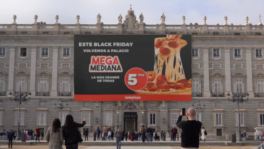 Si hace unos meses Telepizza lanzaba su campaña ‘Viva La Masa’ (agencia creativa Sioux & Cyranos) con una llamada muy especial de Yolanda Ramos desde el Palacio Real, este Black Friday regresa a este espacio con una campaña de street marketing que apuesta por un contenido CGI para el entorno digital.