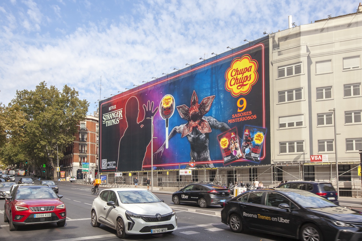 Y para anunciar, Chupa Chups ha instalado, en la calle Princesa de Madrid (junto al Palacio de Liria), una lona que tiene la particularidad de transformarse según la luz: durante el día muestra la silueta de Once y el Demogorgon en una composición creativa.