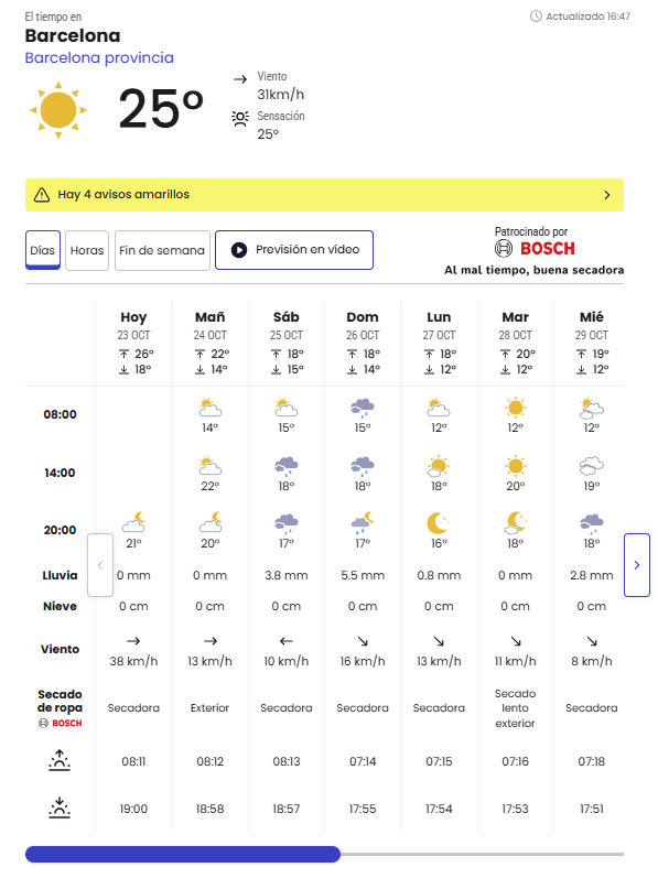 - Faldón en las previsiones del tiempo. Integrado en el contenido más consultado del site, el faldón aparece en el momento exacto en que el usuario consulta lluvias o alta humedad, ofreciendo la respuesta inmediata: “Al mal tiempo, buena secadora. Seca #LikeABosch”.