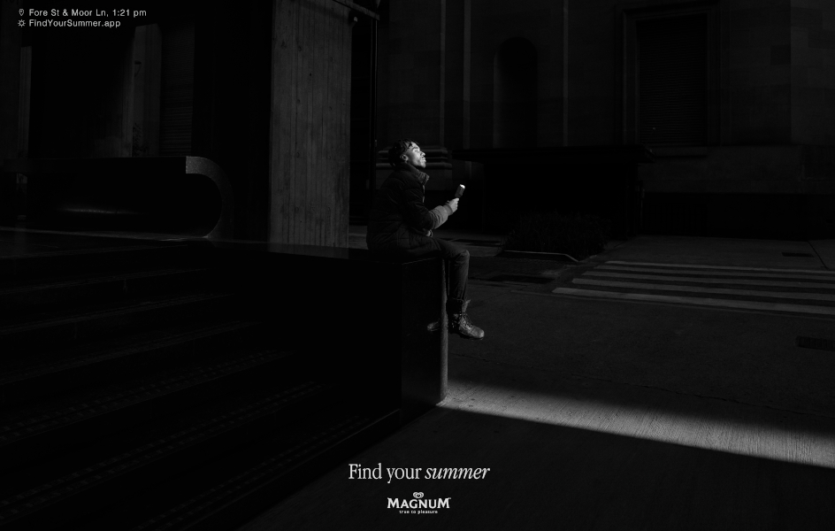 Lo primero que hizo Magnum fue un estudio sobre cómo se sentían los británicos en el invierno: el 81% de los encuestados lo odiaban y el 60% aprovechaba la hora de la comida para salir un rato y disfrutar de algo de claridad antes de volver al trabajo. Unos datos que dieron un insight a la agencia: el invierno, la época del año en la que más necesitan el placer es, precisamente, cuando menos lo disfrutan. La creatividad de la campaña "Find your summer" buscaba animar a los consumidores a mirar el invierno con otros ojos y se centró en esos instantes en el que el frío desaparece y el verano llena el cuerpo y la mente. Las piezas usaron el blanco y negro para mostrar rayos de luz qque acariciaban fugazmente a los personajes, con un Magnum en la mano. Además, utilizando datos en tiempo real sobre la posición del sol, se crearon OOH digitales eseciales, que msotraban cuándo y dónde se podía encontrar el próximo rayo de sol más cercano.