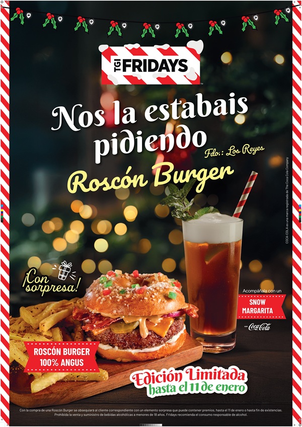 “El éxito del año pasado nos ha impulsado a innovar de nuevo. Estas Navidades volvemos con la Roscón Burger, una propuesta única que combina una de las tradiciones más emblemáticas de la Navidad en España con los sabores más característicos de la gastronomía americana, para seguir sorprendiendo a nuestros clientes” señala Lidia Ferrer, directora de marketing de TGI Fridays.