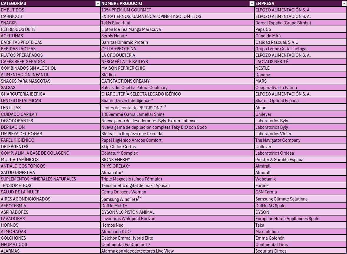 Los galardonados en España han sido designados tras un estudio realizado el pasado mes de octubre entre el panel de consumidores de Netquest y Samplia a una selección de productos nuevos lanzados al mercado entre el 1 de enero de 2024 y el 31 de octubre de 2025 en los sectores de Alimentación, Higiene-Cosmética, Droguería, Electrodomésticos, Hogar, Parafarmacia, Bazar y Servicios.