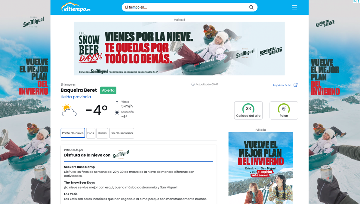 La integración se desarrolla en el entorno especializado del medio, con información actualizada sobre condiciones de nieve y meteorología. En este contexto, San Miguel refuerza su territorio de marca vinculado al ocio, la naturaleza y la socialización, alineando su comunicación con un momento clave de consumo como es la temporada invernal. Además de acompañar al usuario, el anunciante quiere estar presente en la fase de inspiración y planificación del viaje.