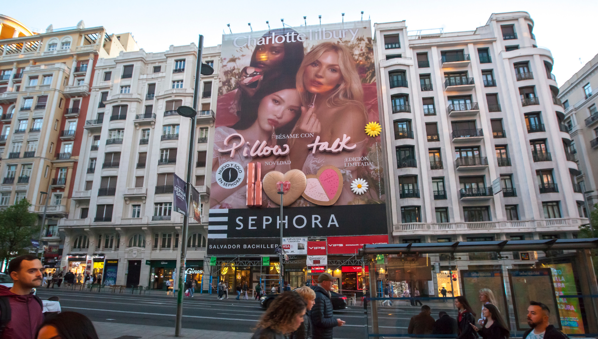 La Gran Vía madrileña acoge estos días acción de exterior de “gran belleza”. Sephora, junto a su agencia de medios e innovación Dentsu, ha desplegado una lona de gran formato que da vida a la nueva colección Pillow Talk in Bloom de Charlotte Tilbury, incorporando elementos tridimensionales que sobresalen de la fachada y convierten el centro de Madrid en un escaparate inmersivo de belleza.