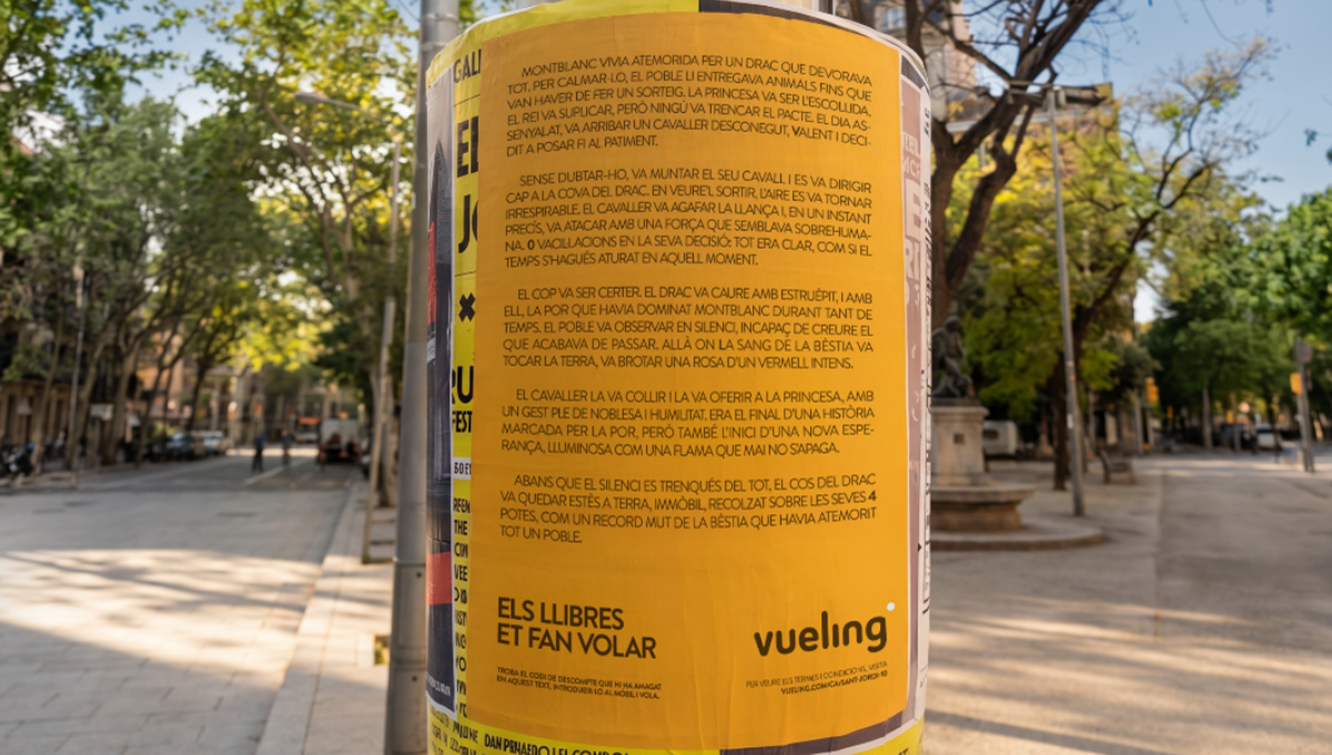 La primera de ellas es la distribución por la Ciudad Condal de fragmentos de la leyenda de Sant Jordi, que podrán encontrarse en diferentes columnas publicitarias de la ciudad, con un mensaje claro: “Lee con atención, los libros te pueden hacer volar”.