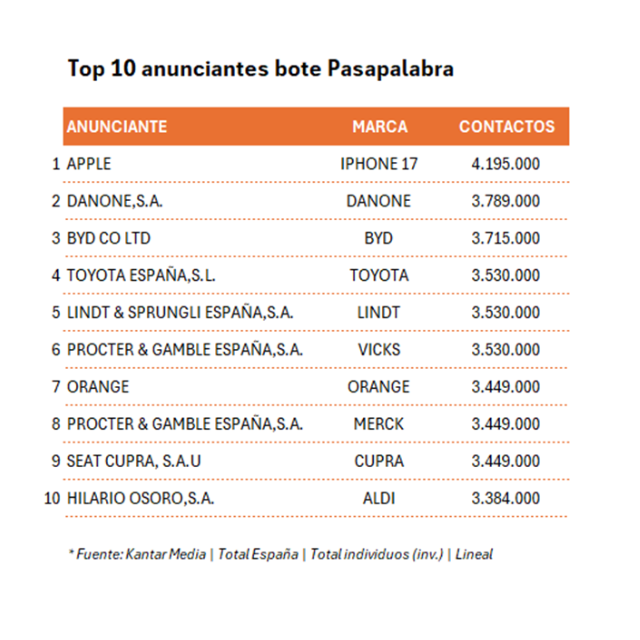 El spot exclusivo del Rosco, de iPhone 17, se ha convertido en el más visto de los 3 últimos años (solo por detrás de los pases del simulcast de Campanadas) alcanzando un total de 4.195.000 contactos. Pero no solo tuvo una audiencia millonaria este spot. Todos los pases del programa rondan los 3,5 millones de espectadores de media.
